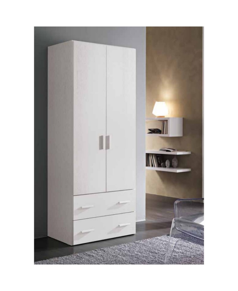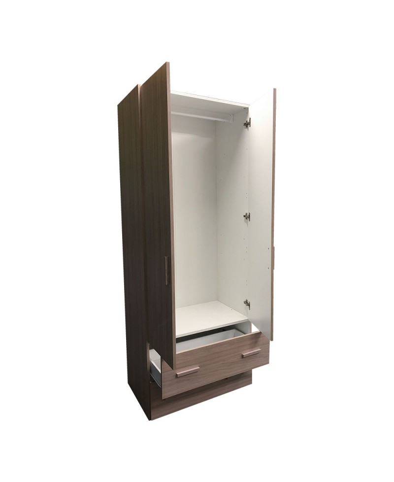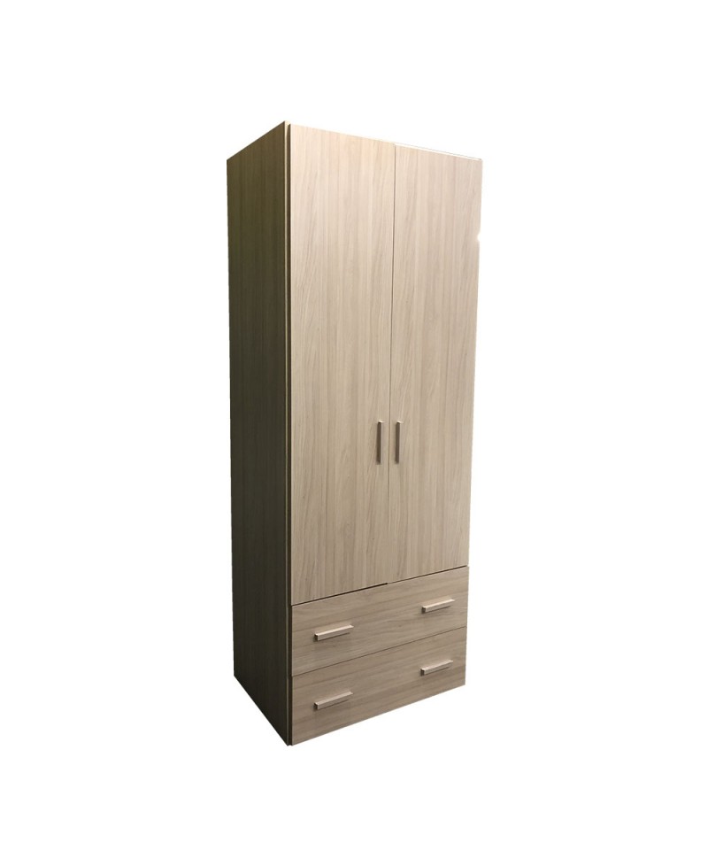 Armadio a 2 ante battente 2 cassetti con guide metalliche. Realizzato con pannelli in nobilitato melaminico di classe E1, secondo normativa CEE a bassa emissione di formaldeide. I pannelli sono di spessore 22 mm.