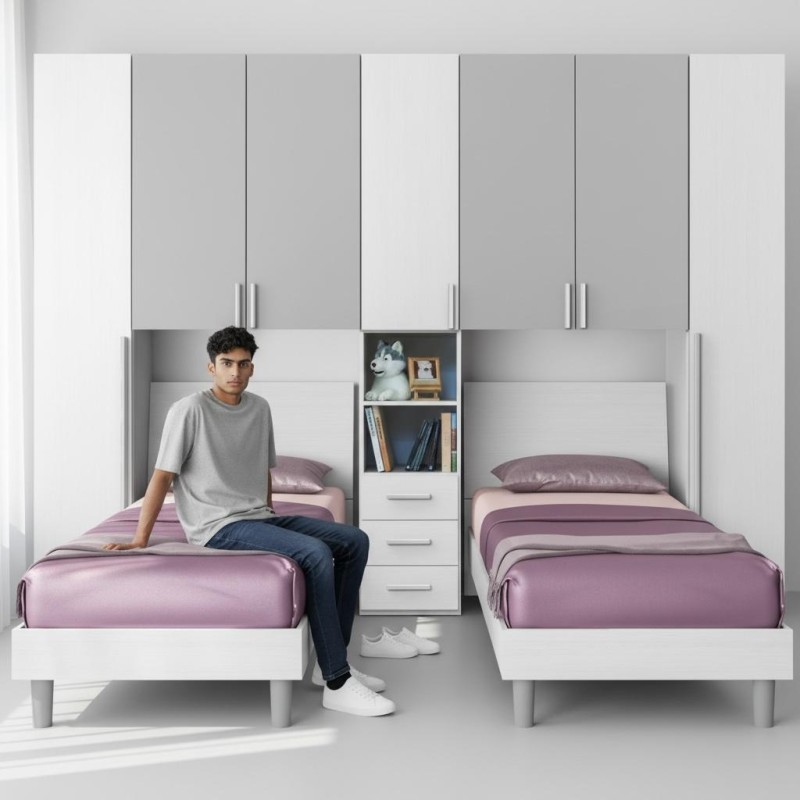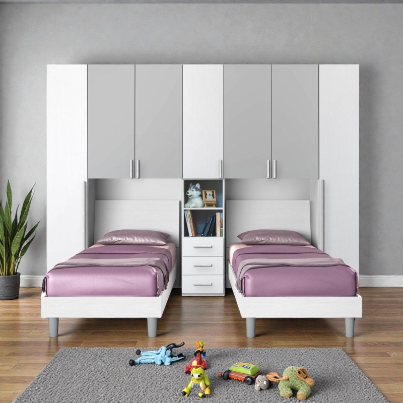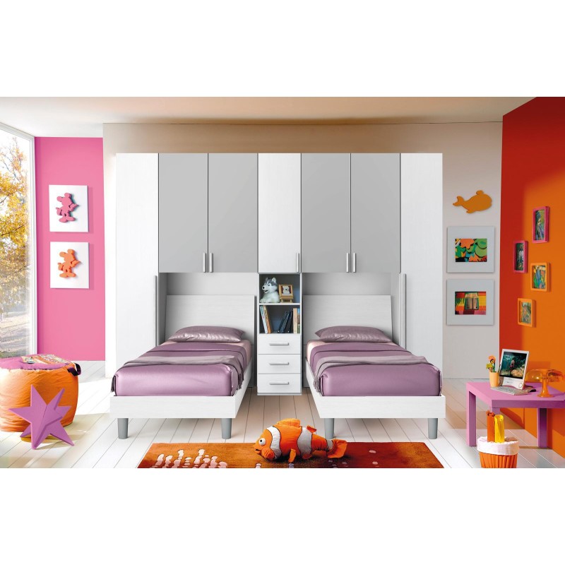 Spaziosa cameretta modello ROSY con 2 letti singoli divisi da uno spazio a giorno e cassetti.
