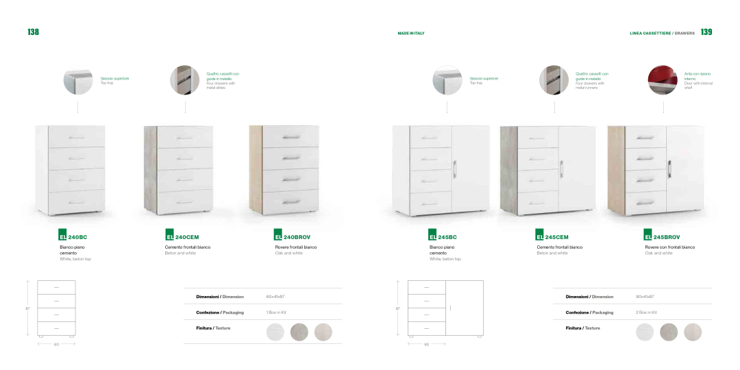1 – Articolo EL 240, dimensioni L.60 * P.41 * H.87 cm (1 Box in kit) nelle seguenti varianti di codice e colore: