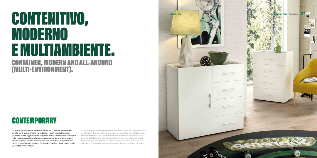 La versione a cassettiera è dotata di quattro cassetti e un ampio ripiano. Non solo colorazioni particolari, ma presenta anche una forma innovativa che ricorda un pratico vassoio portaoggetti. La cassettiera è disponibile in diverse finiture.