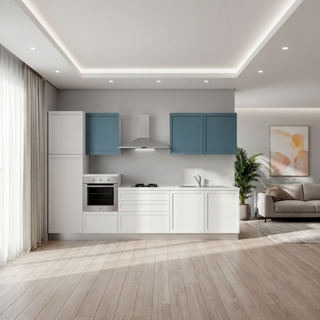Proposta di cucina lineare dal design moderno ed elegante, caratterizzata da una raffinata combinazione cromatica bianco frassinato per le basi e avio per i pensili, ideale per ambienti contemporanei e funzionali.