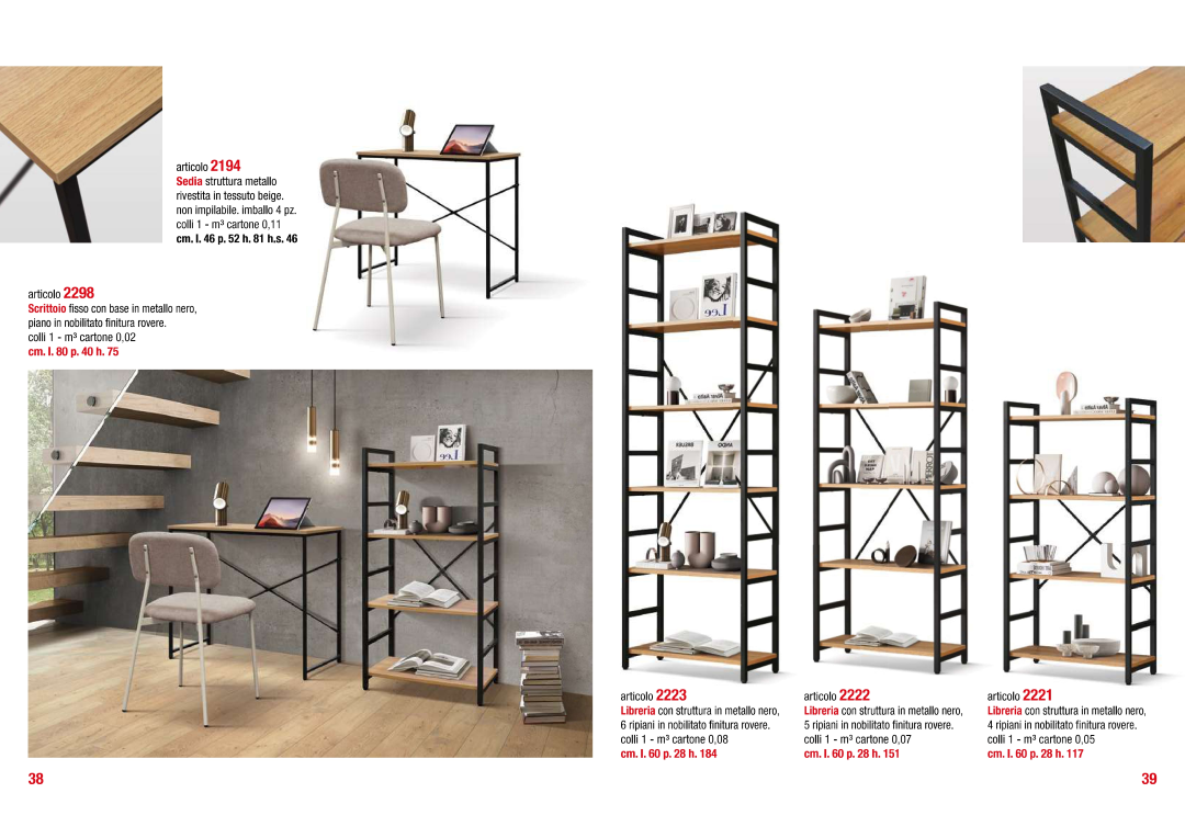 3 – Articolo 2223: Libreria con struttura in metallo nero, 6 ripiani in nobilitato finitura rovere, dimensioni L.60 * P.28 * H.184;