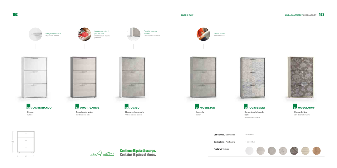 1 – Articolo EL 7003, dimensioni L.67 * P.28 * H.112 cm (1 Box in kit) nelle seguenti varianti di codice e colore: