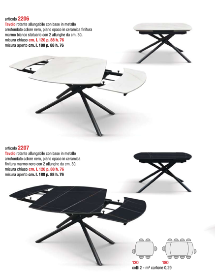 2- Tavolo rotante allungabile con base in metallo arrotondato colore nero, piano opaco in ceramica finitura marmo nero con 2 allunghe da cm. 30.